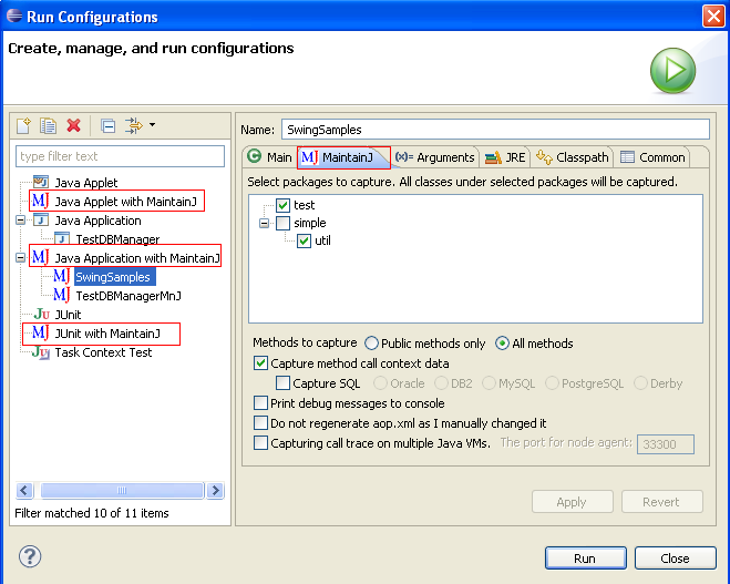 3) Create a new configuration for your type of application just as you would when running without MaintainJ. In the MaintainJ tab, choose the packages that you want to capture. Choose only the packages of interest and avoid very high level packages. If you want to capture the values of parameters and return value for each call, select 'Capture method call context data'. You can also capture the actual runtime sql statements your application is sending to the database server by selecting 'Capture SQL' and then choosing your database.