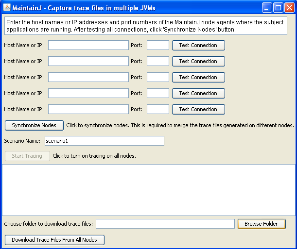 3) You may trace any combination of Java applications running on different JVMs - multiple J2EE applications or a socket server application and a J2EE application, etc. Once all the applications are started with MaintainJ, go back to the MaintainJ Node Manager window opened in step 1.