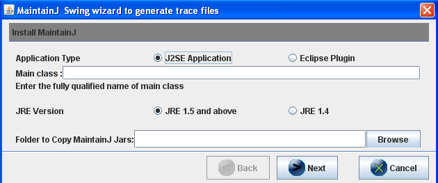 2) Select Application Type as J2SE Application. Select a folder to copy the MaintainJ related files. Provide the absolute name of the main class (the class with public static void main(String[]) method).