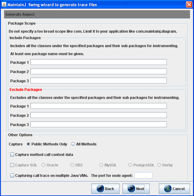 The above xml file does not capture method call context data, JSP's and the SQL statements. If you want to add those options, either contact MaintainJ customer support or use one of the wizards to first generate the xml and then edit it as necessary.